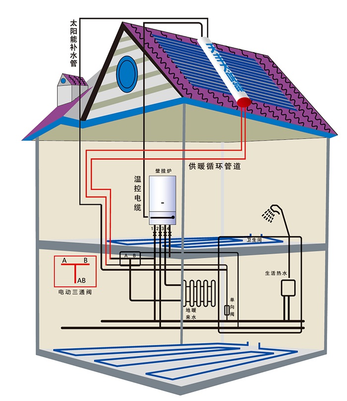 本系統(tǒng)主要由太陽能集熱器、蓄熱水箱、輔助能源裝置、板式換熱裝置、水泵、智能控制裝置等組成。